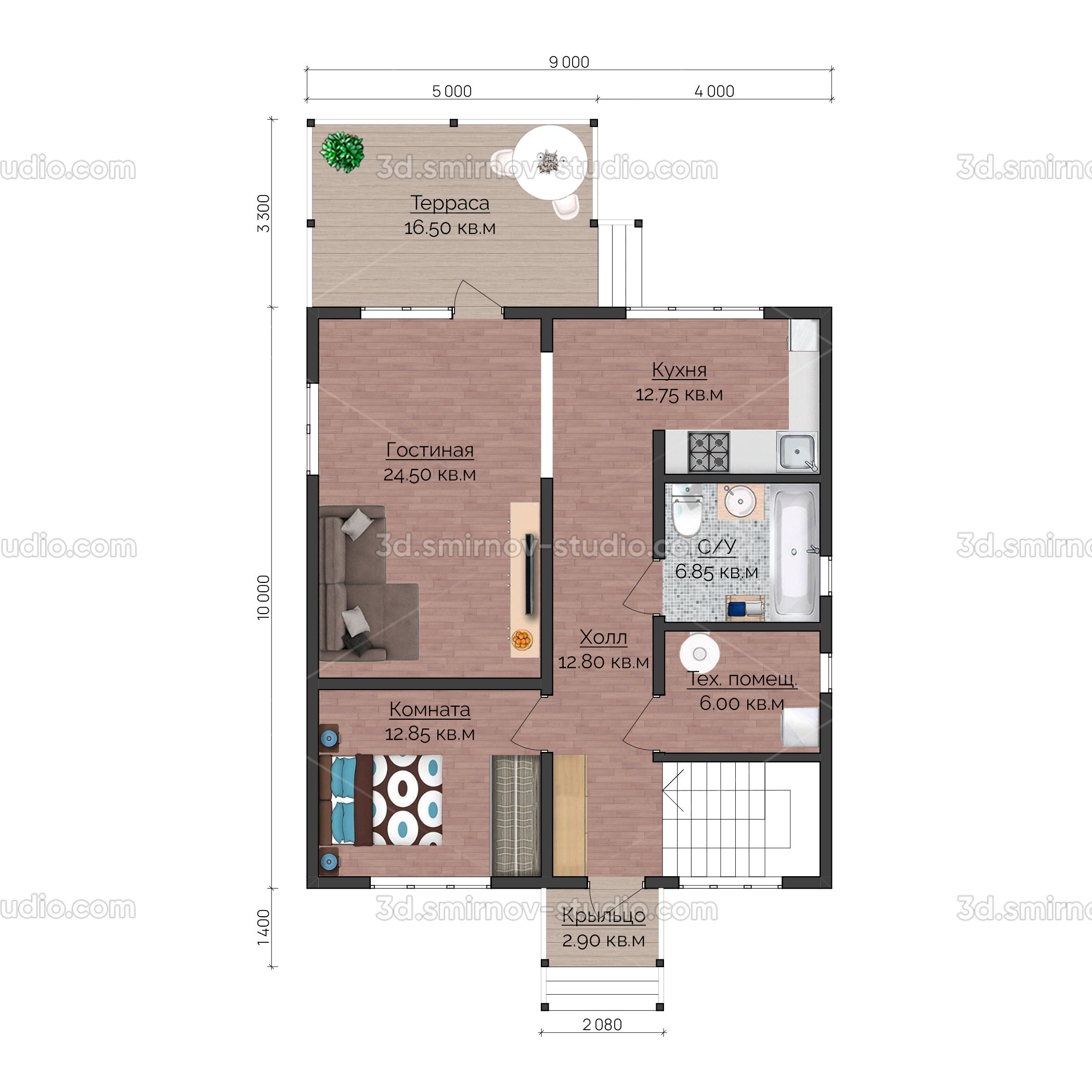 Проект включил в себя 3 эскиза с разных ракурсов, 4 фасада, а также индивидуальная 2D планировка с визуальной расстановкой мебели и декоративных элементов.